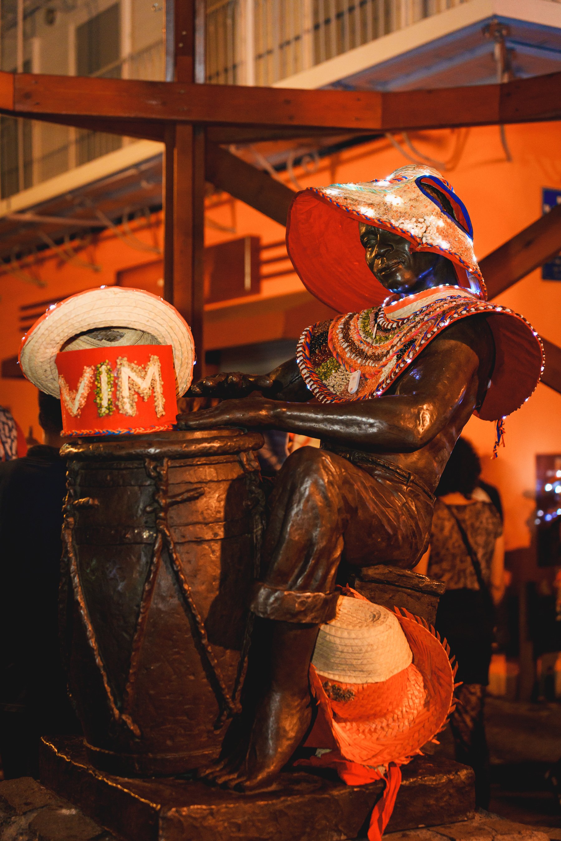 Au cœur de Pointe‑à‑Pitre, la statue de Vélo se transforme le temps d’une pause en icône carnavalesque, parée d’éléments de costume déposés par VIM.